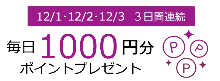 12/1・12/2・12/3の3日間、ラフィネにご登録いただいている全ての会員様を対象に、毎日1000円分のポイントをプレゼント!